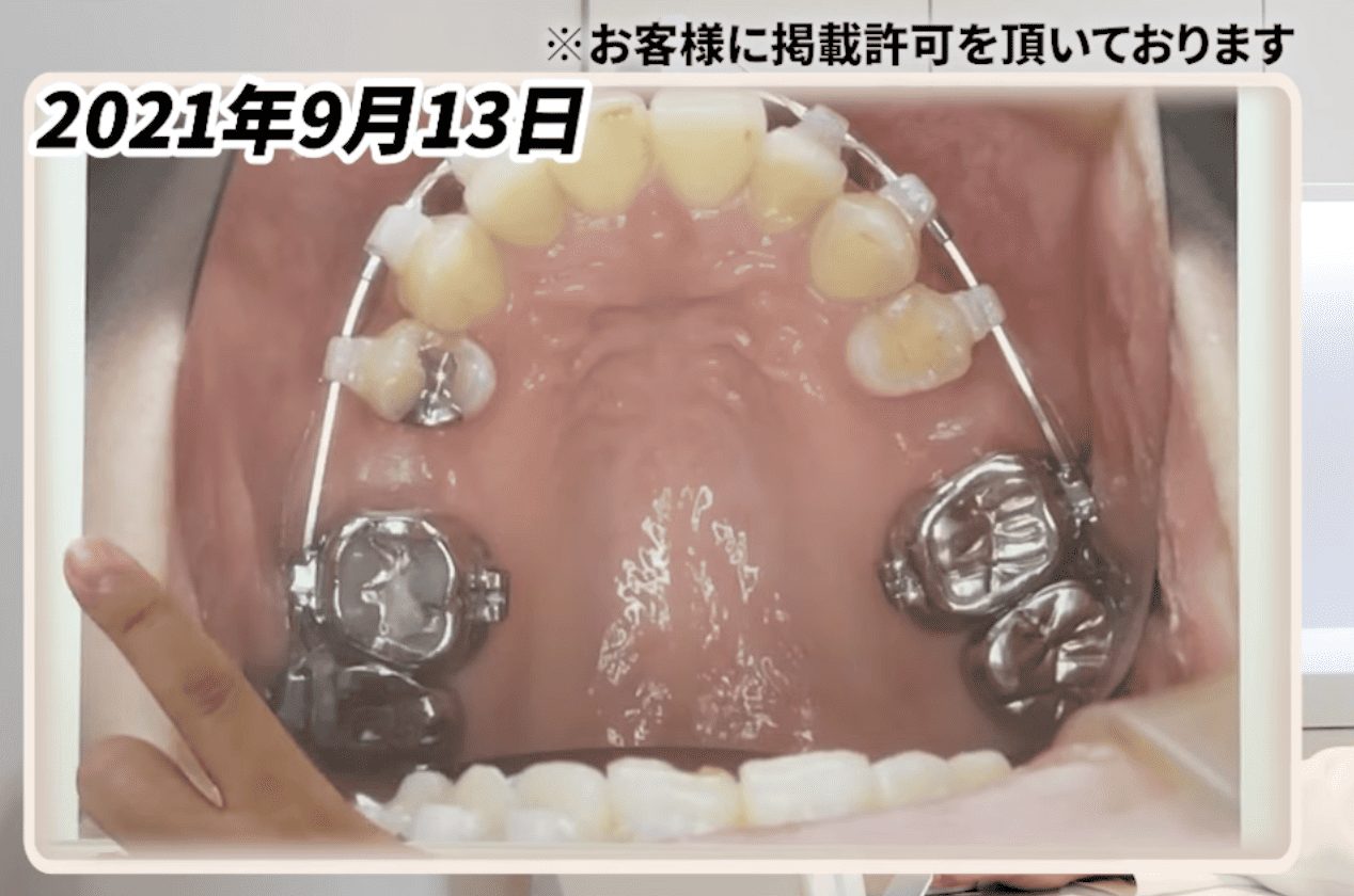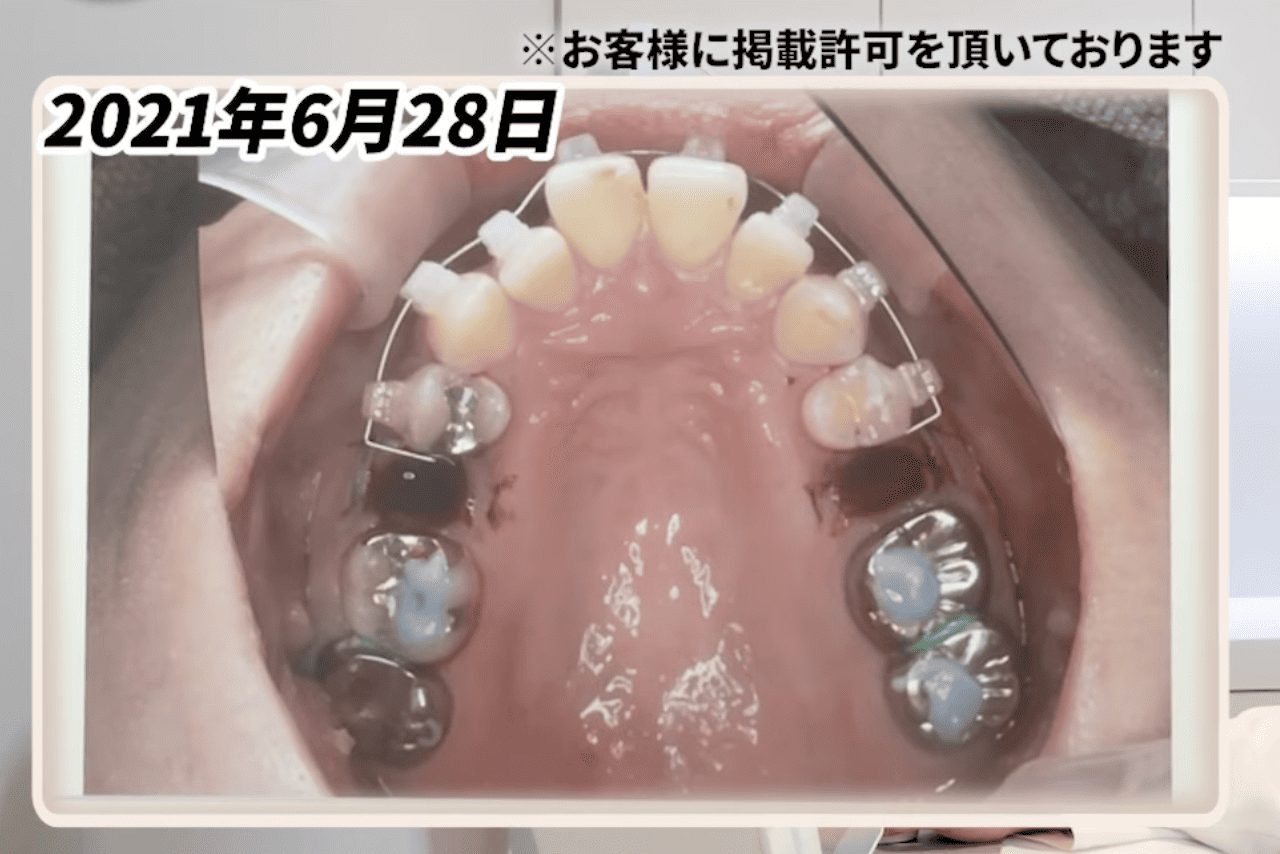なお、このケースでは奥歯を完全に固定せず、わずかに前方へ動かすことを許容する「アンカレッジロス」を意図的に使いながら治療を進めていました。前歯と奥歯の両方がわずかずつ動くことで、スペースクローズのスピードを高めることができます。完全固定で前歯だけを動かすよりも隙間が埋まるのが早いため、症例によってはこの方法が選択されます。