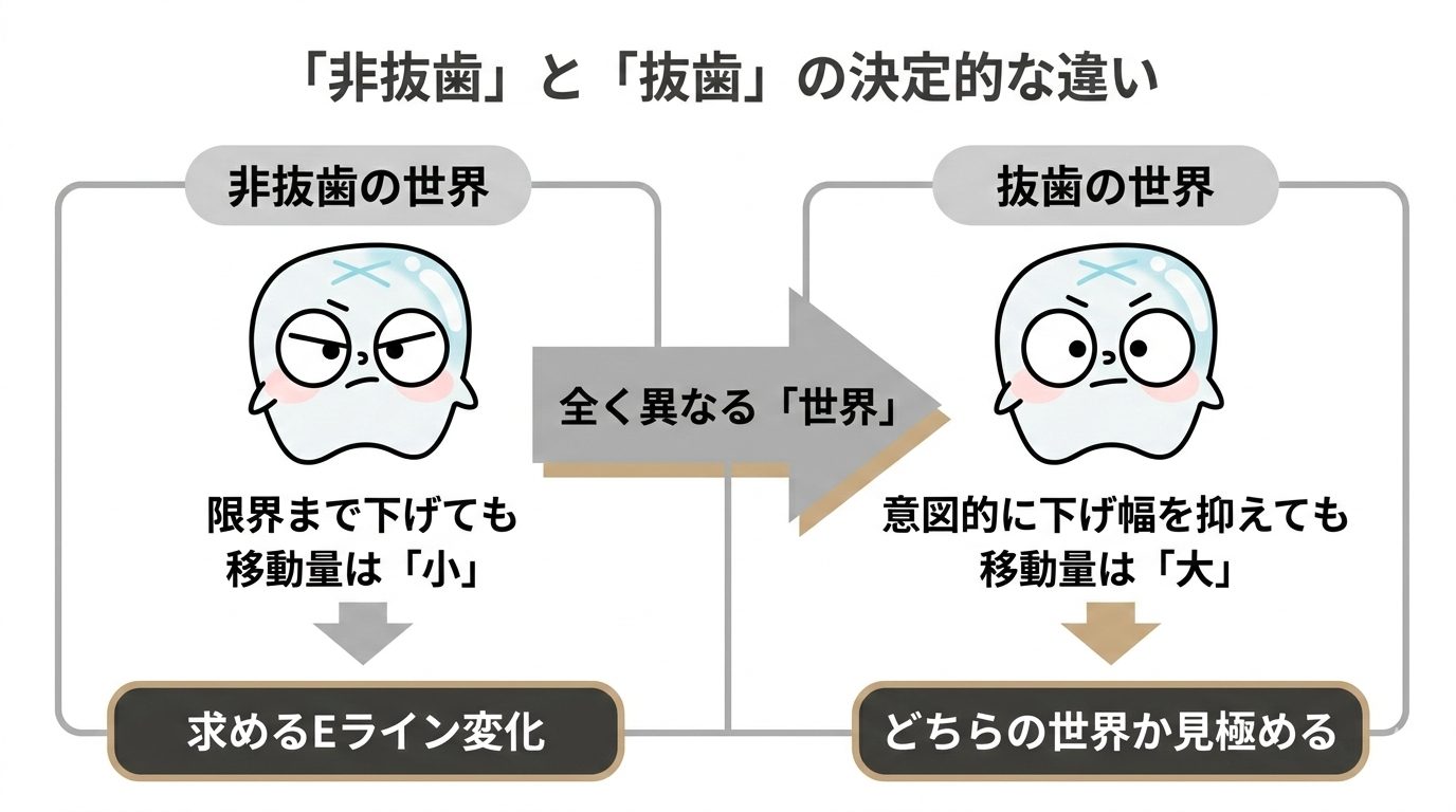 これらは単なる延長線上にある選択肢ではなく、全く異なる「世界」として捉える必要があります。非抜歯の場合はアンカースクリューを用いて限界まで下げても、抜歯を伴う治療で意図的に下げ幅を抑えたケースよりも下がり幅は小さくなります。患者様が求めるEライン 変化の大きさが、どちらの世界に属しているのかを初診時に見極めることが、後悔しないための大前提となります。