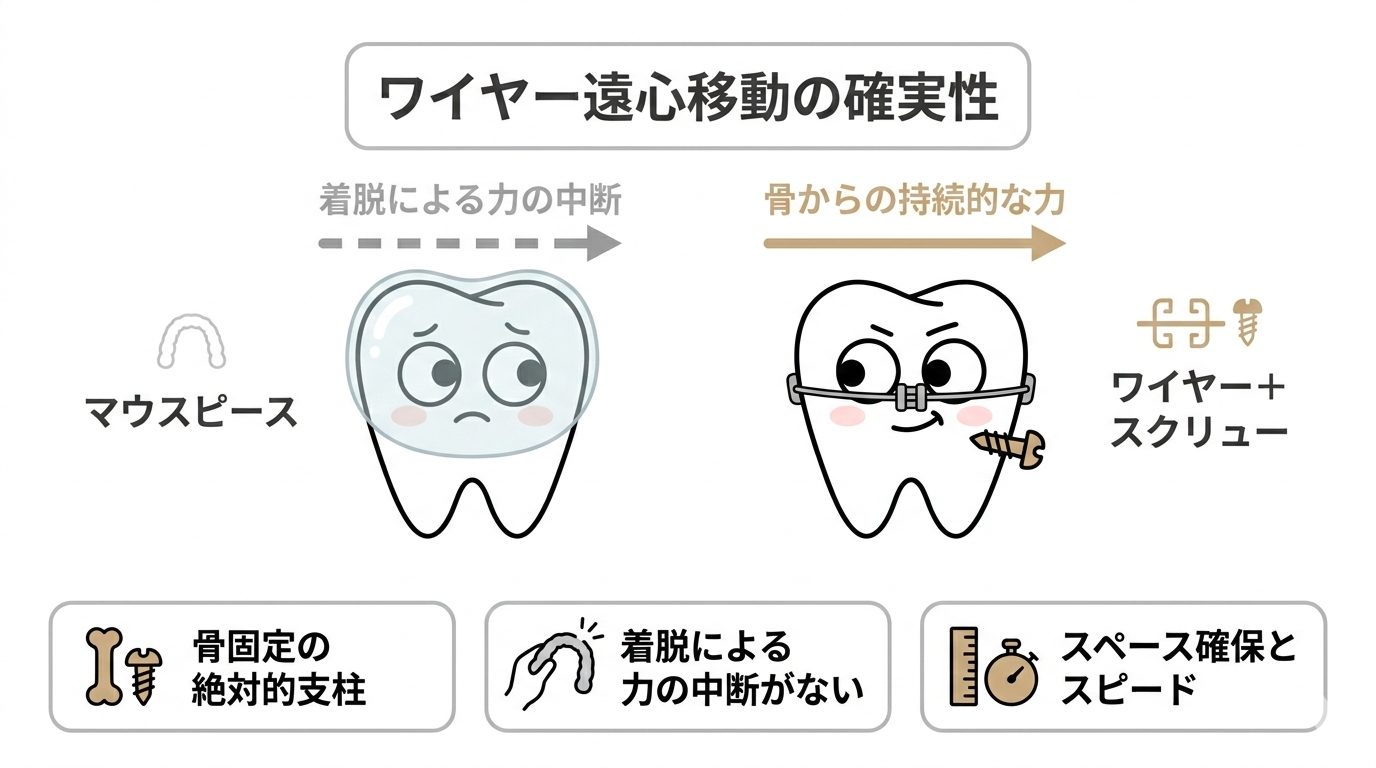 骨と同化した絶対的な支柱(アンカースクリュー)から牽引することで、マウスピースのように着脱による力の遮断が起こりません。確実性とスピードを重視するならば、物理法則に基づいたワイヤーによる牽引が最も合理的です。歯槽骨の範囲内で安全にスペースを確保し、思い通りの位置まで歯を下げることを可能にします。