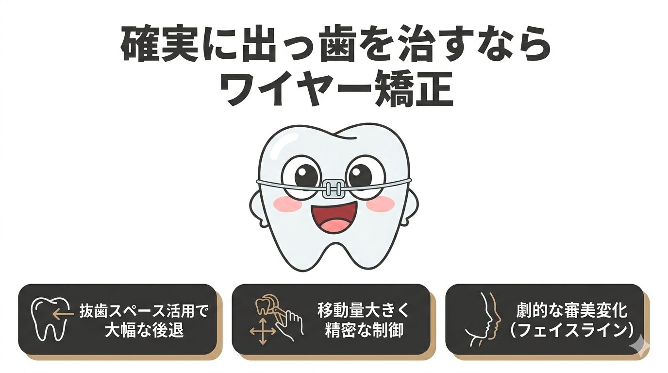 「出っ歯を改善したい」という強い希望がある場合、移動量の大きさと精密な制御が必要になるため、ワイヤー矯正こそが最短かつ最良の手段となります。