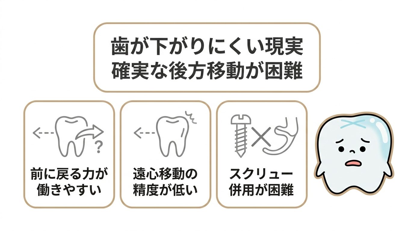 インビザラインなどのマウスピース矯正は、奥歯を後ろに移動させる際に反作用で歯が前に戻りやすく、確実な後方移動が難しいという構造上の弱点があります。