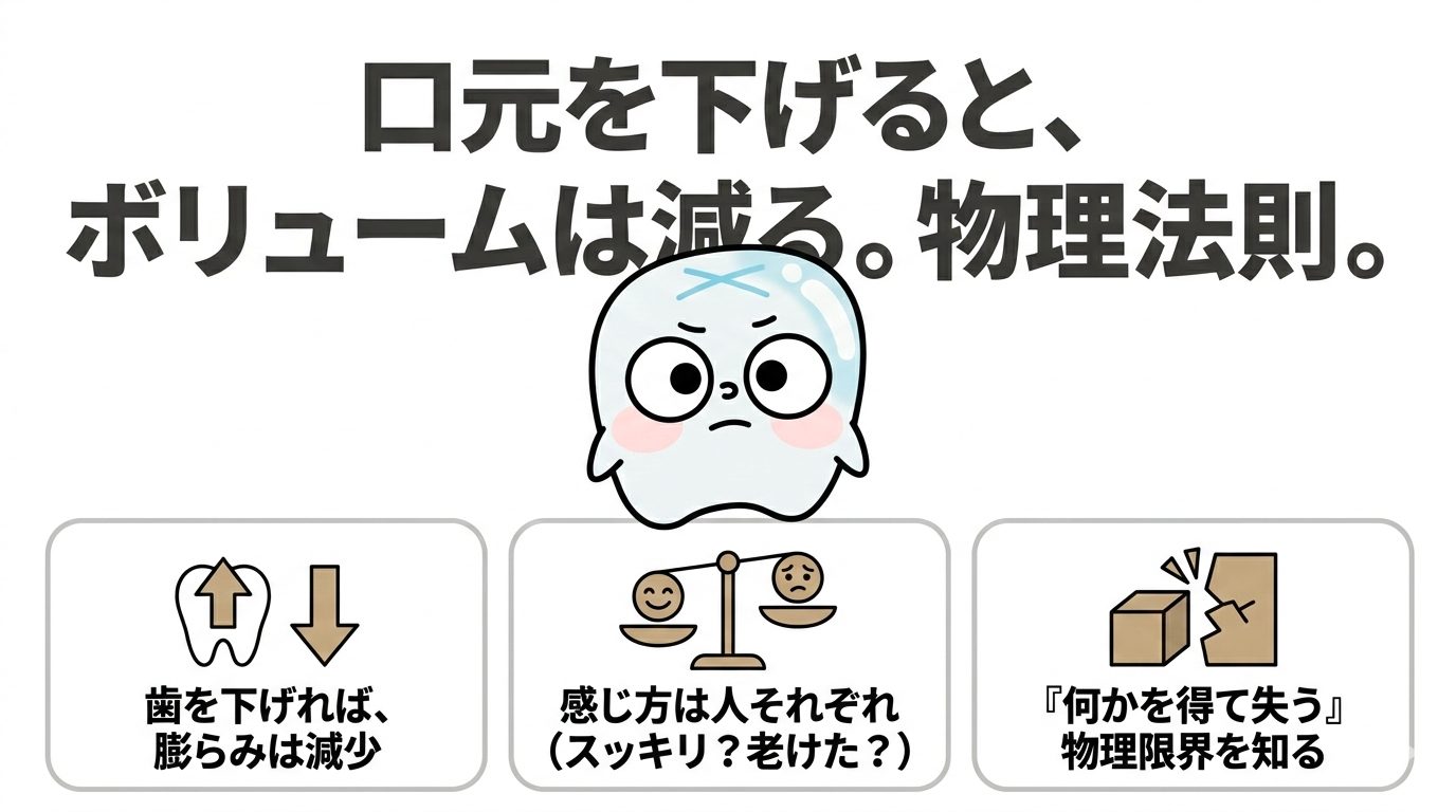 「口元は下げたいけれど、顔のボリューム感は残したい」という要望は、物理法則に反する「冷たい温水」を求めるような矛盾を含んでいることがあります。