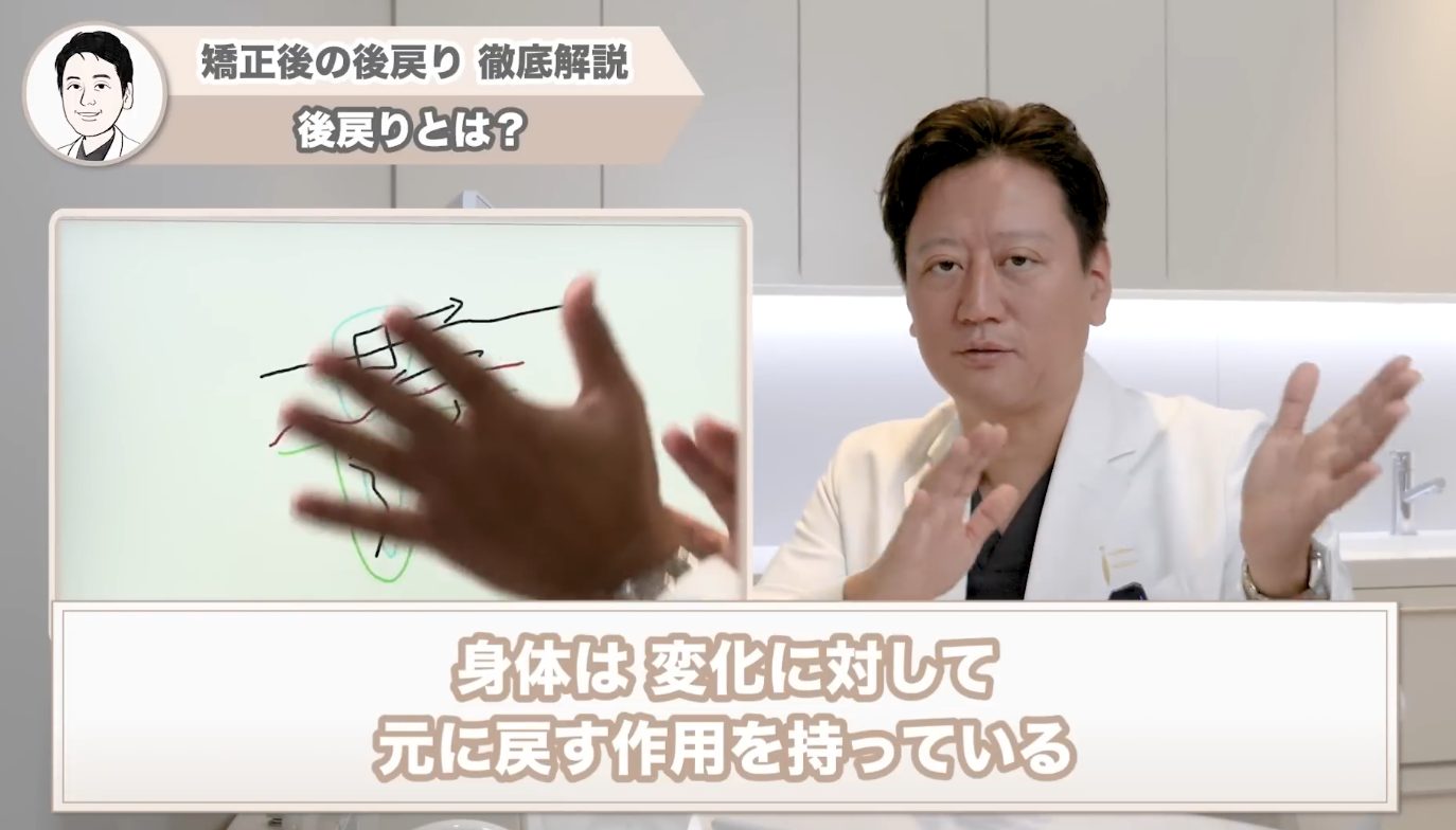 歯列矯正とは、歯を支える骨が溶けて新しく作られるという代謝の仕組みを利用して歯を動かす治療です。ブラケットやマウスピースなどの装置で歯に適切な負荷をかけると、動く方向の骨が溶け、反対側に新しい骨が形成されます。この一連の流れは体にとって大きな変化であり、生物には変化した状態を元通りにしようとする本能的な働きが備わっています。指で皮膚を強く押しても、離せばすぐに元に戻るのと同じように、歯も装置による強制的な力がなくなれば、元の位置へと引き戻される力が働きます。