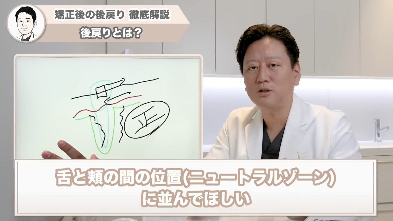 歯並びは、内側からの舌の力と、外側からの頬やくちびるの力のバランスが均衡するニュートラルゾーンと呼ばれる領域に維持されます。矯正によって歯の位置を大きく変えたとしても、舌の癖やくちびるの筋肉の強さが変わっていなければ、歯は再び筋肉のバランスが取れる位置へと押し流されてしまいます。特に成人矯正の場合、何十年もかけて形成されたお口周りの筋肉の習慣は非常に強く、これが後戻りの大きな要因となります。